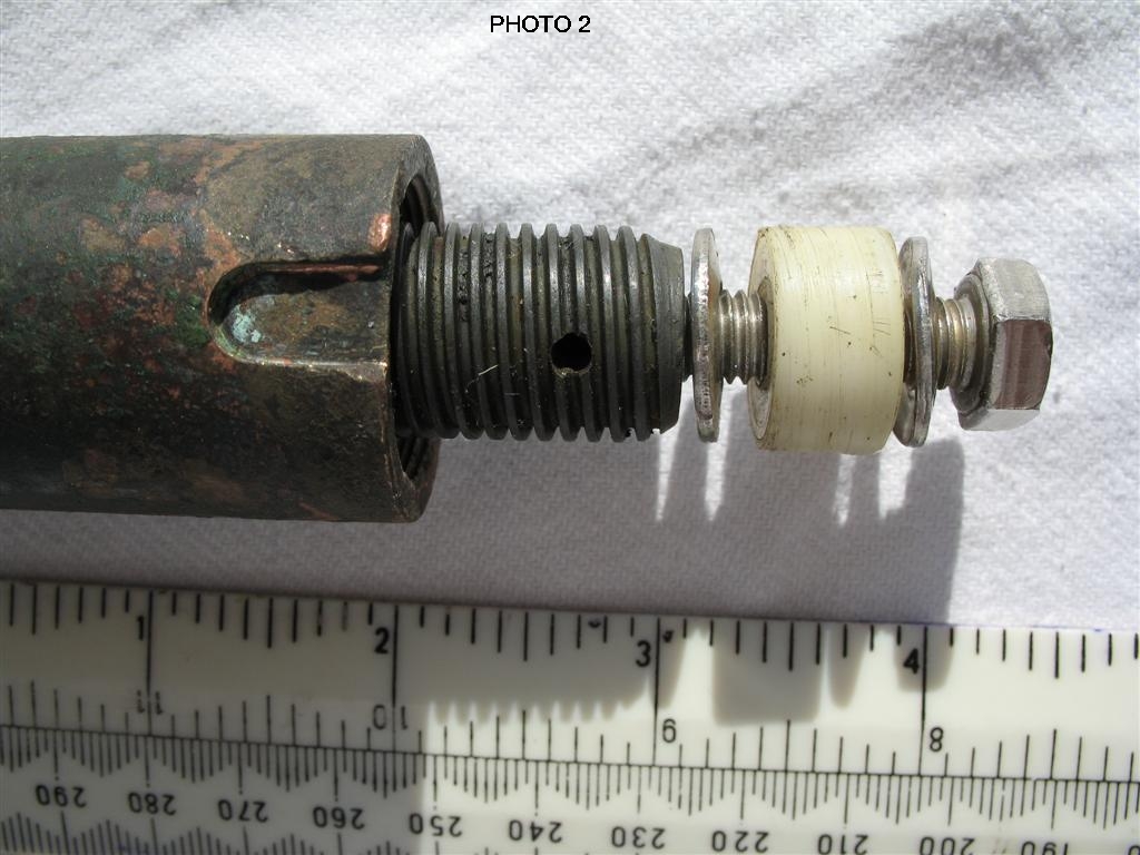 - At the end of the coarse-threaded rod you will see the thick white plastic washer located between two thin stainless steel washers all held in place by a 30mm M8 bolt in A4 stainless. I think the function of the thick washer is to prevent the end of the screwed rod from damaging the inside of the keel-tube when the jack is raised and lowered and the threaded rod passes up and down inside the keel tube. The M8 bolt is prevented from rotating as the jack turns by a 3mm roll pin inserted through the threaded jack rod into the bolt. The roll pin only goes half way into the bolt so unfortunately cannot be drifted out. Use the handle and a ring spanner to turn the bolt and break the roll pin then withdraw the bolt and washer assembly and make sure you have got rid of all the roll pin fragments. Photo 2 shows the roll pin removed and the M8 bolt in position.