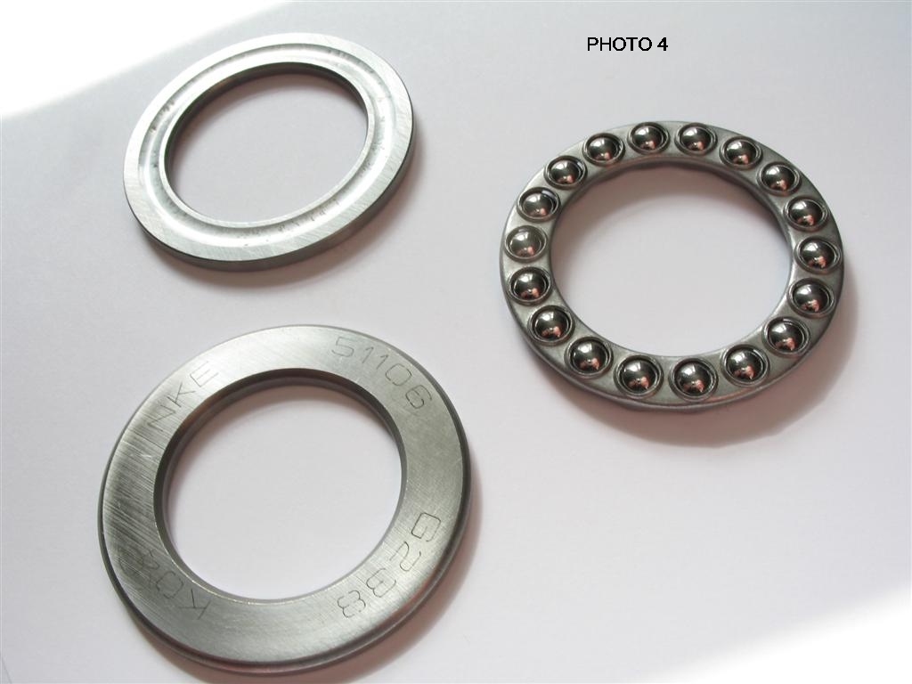An alternative explanation might be simply a faulty bearing. The bearing is made up of 18 balls in a cage in-between two seats, the balls run in grooves in the two seats, the outer side of each seat being flat. Photo 4 shows the three components of a new bearing. In Photo 3 it can be seen that the upper seat of my bearing was found to be fractured - this could have been due to a fault in the manufacture of the seating.