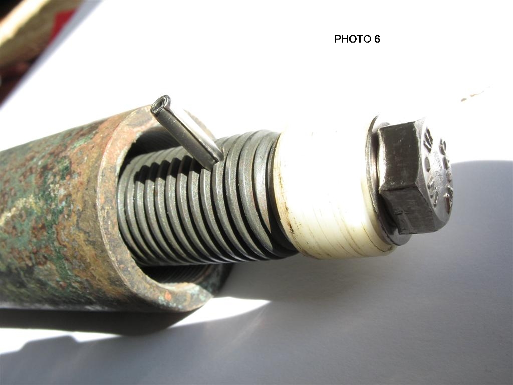 - Screw in the M8 bolt with the three washers so that the hole in the threaded jack rod is lined up with the hole in the bolt and insert the new roll pin. See Photo 6. Sharp eyed readers will see that the replacement for the roll pin is actually a spring pin. I could not obtain a 5mm long roll pin and had to make do with a 10 mm spring pin snipped down to be flush with the thread - it does the job. I also used some Loctite 577 on the M8 bolt thread just to make sure!