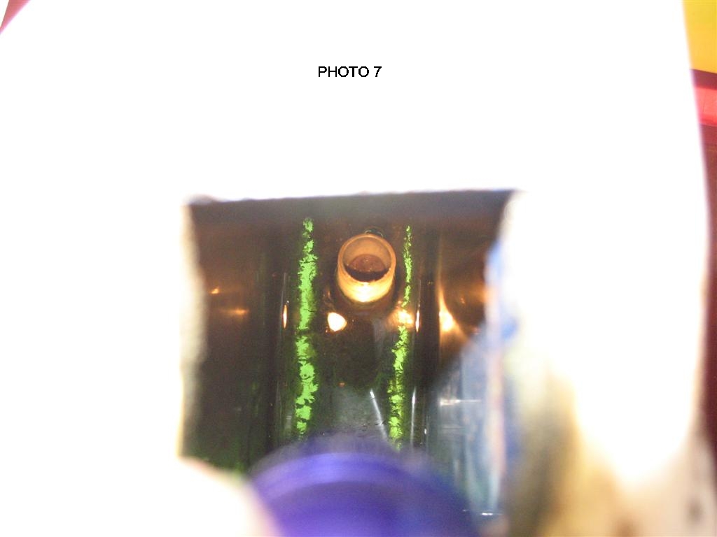 - Insert the jack assembly back down into the casing and screw it down into the keel-tube. I found this the most difficult part of the operation as the keel-tube is inclined to tilt forward so you have to locate it by wiggling the jack around and turning it clockwise eventually you will feel that it is engaged and screwing on. (Photo 7 shows what the top of the keel-tube looks like when looking down into the casing. The keel-tube is just above the level of the water, the purple object is a Maglite torch as this is a very difficult scene to light!). Once you have threaded it on you can use the jack handle to tighten it up 12-14 turns clockwise. Loctite 577 takes about 3 hours to cure so I would leave it to cure before turning the handle anti-clockwise just to make sure it doesn’t come undone (This may not really be necessary as the friction in the fine thread will be much greater than the well greased coarse thread of the jack but better safe than sorry).